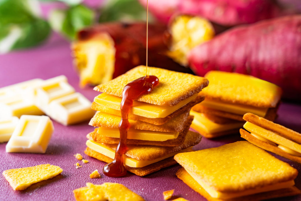 千葉県産さつまいもの焼き芋ペーストをふんだんに練りこんだラングドシャに、キャラメルソース入りのホワイトチョコレートをサンドしました。甘く上品な焼き芋の風味、ラングドシャのサクサク触感がたまらない、お芋のスイーツです。